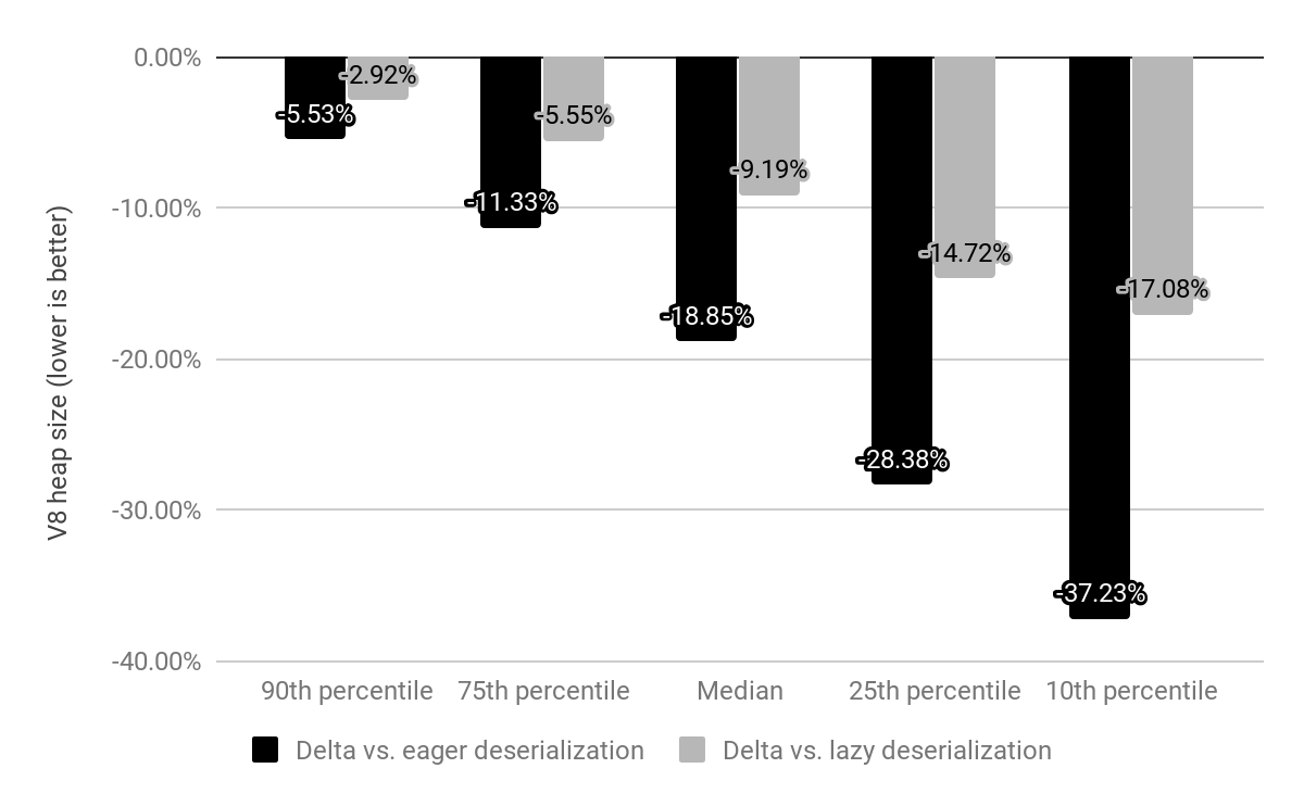 Compared against eager deserialization, we reduced the median V8 heap size by 19%. The median Chrome renderer process size per site has decreased by 4%. In absolute numbers, the 50th percentile saves 1.9 MB, the 30th percentile saves 3.4 MB, and the 10th percentile saves 6.5 MB per site.