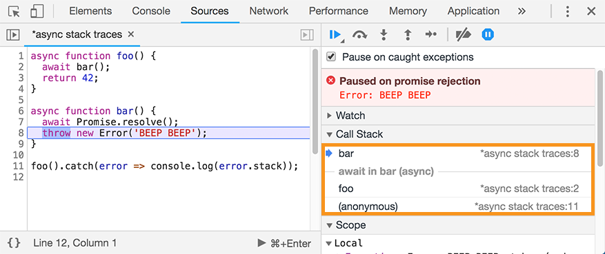 In addition to performance, JavaScript developers also care about the ability to diagnose and fix problems, which is not always easy when dealing with asynchronous code. Chrome DevTools supports async stack traces, i.e. stack traces that not only include the current synchronous part of the stack, but also the asynchronous part: