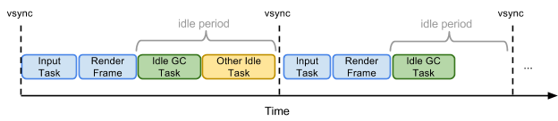 Idle tasks are special low-priority tasks which are run when the scheduler determines it is in an idle period. Idle tasks are given a deadline which is the scheduler’s estimate of how long it expects to remain idle. In the animation example in Figure 1, this would be the time at which the next frame should start being drawn. In other situations (e.g., when no on-screen activity is happening) this could be the time when the next pending task is scheduled to be run, with an upper bound of 50 ms to ensure that Chrome remains responsive to unexpected user input. The deadline is used by the idle task to estimate how much work it can do without causing jank or delays in input response.