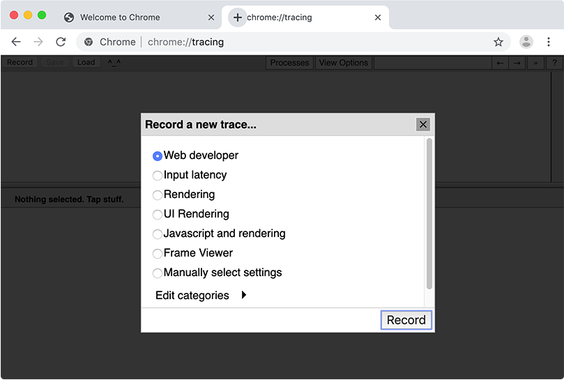 Add a second tab and open chrome://tracing. Tip: you can just enter chrome:tracing, without the slashes.