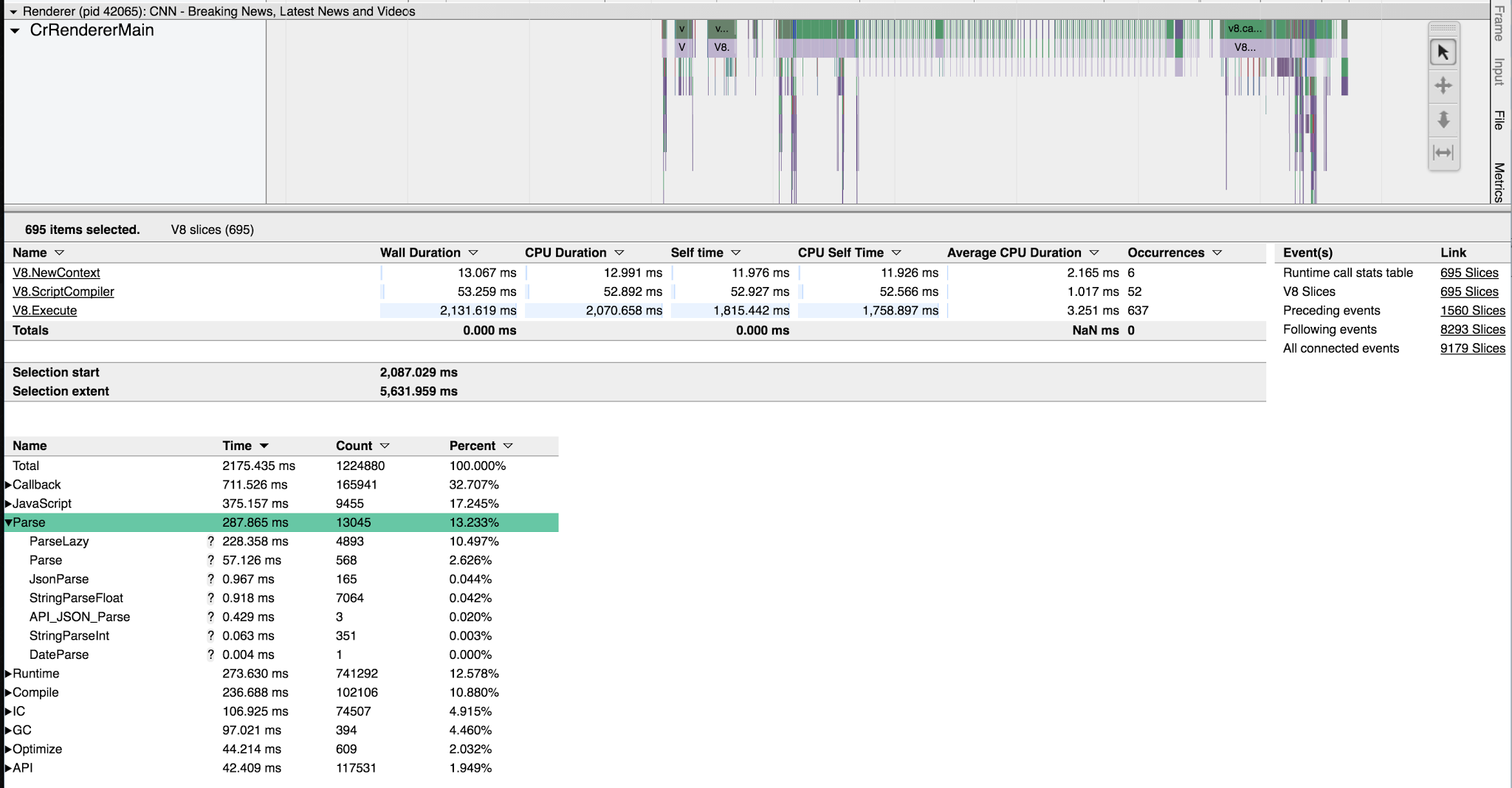 To get Runtime Call Statistics (RCS), please record the trace with the following two categories enabled: v8 and disabled-by-default-v8.runtime_stats. Each top-level V8 trace event contains the runtime statistics for the period of that event. By selecting any of those events in trace-viewer, the runtime stats table are displayed in the lower panel. Selecting multiple events create a merged view.